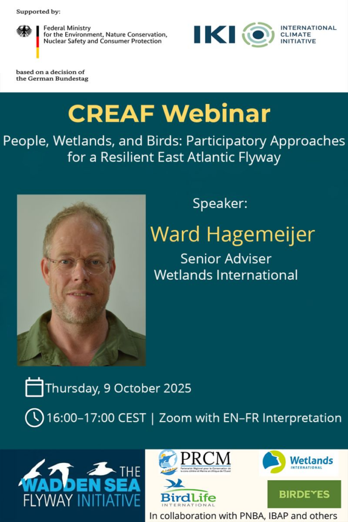 Wetlands International invites you to a webinar titled “People, Wetlands, and Birds: Participatory Approaches for a Resilient East Atlantic Flyway”, to be held on Thursday, 9 October 2025, from 16:00 to 17:00 CEST (Zoom, with English–French interpretation).