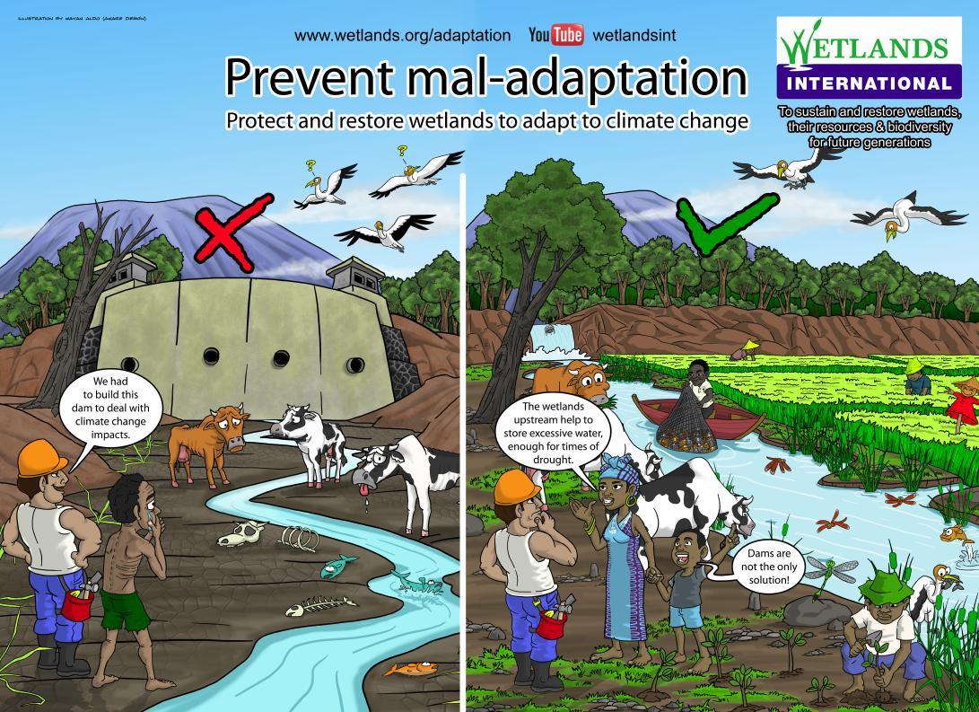 “Prevent mal-adaptation: protect and restore wetlands to adapt to climate change” is the title of this double-sided cartoon postcard explaining how wetlands serve to mitigate impacts and thereby help to adapt to climate change.