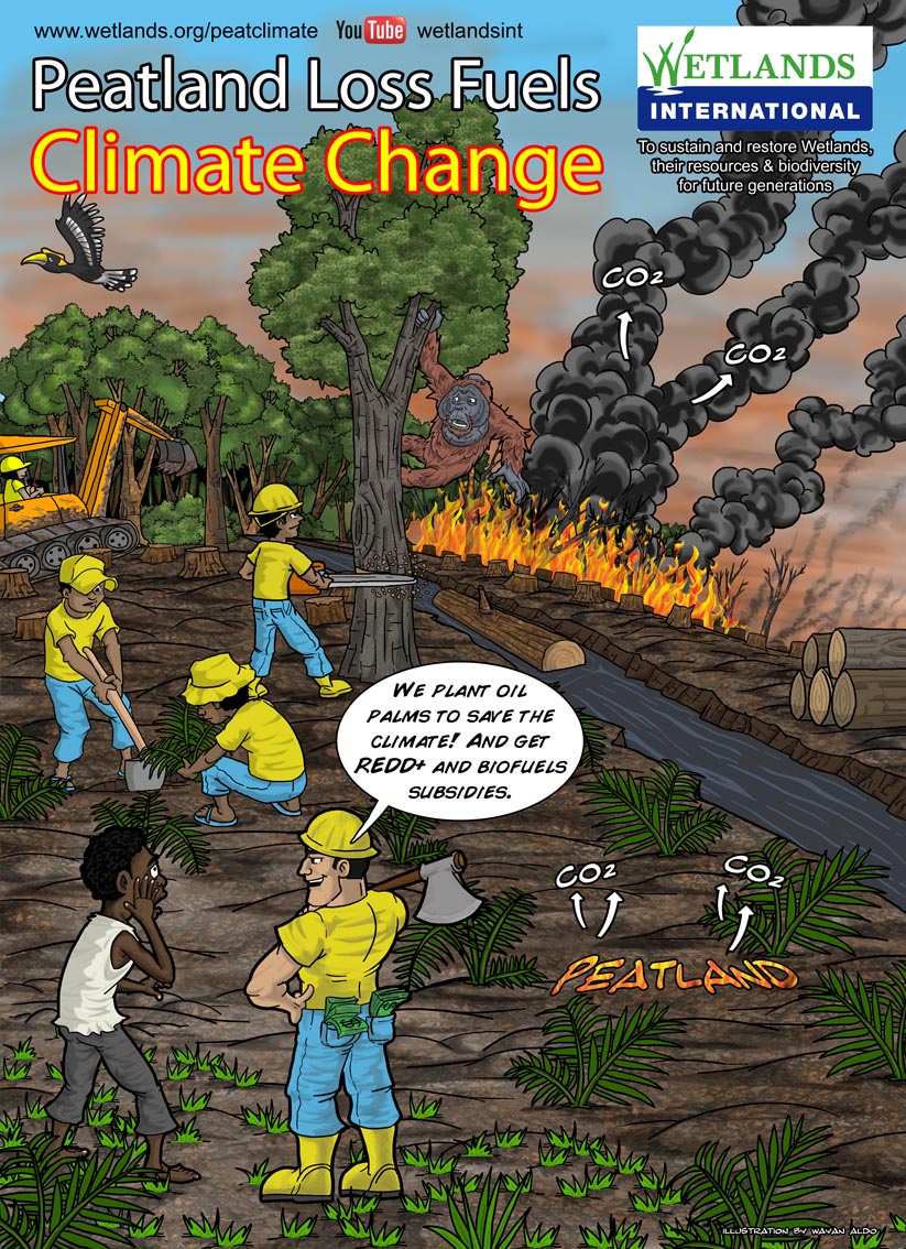 The title of this poster is “Peatland loss fuels climate change”. It is a cartoon showing the conversion of peatlands into palm oil plantation, which causes the release of CO2 through burning practices as well as oxidation of the peat soil from the deforestation and drainage. The palm oil company employee has his pockets filled with dollars, stating “We plant oil palm to save the climate, and get REDD and biofuels subsidies”.