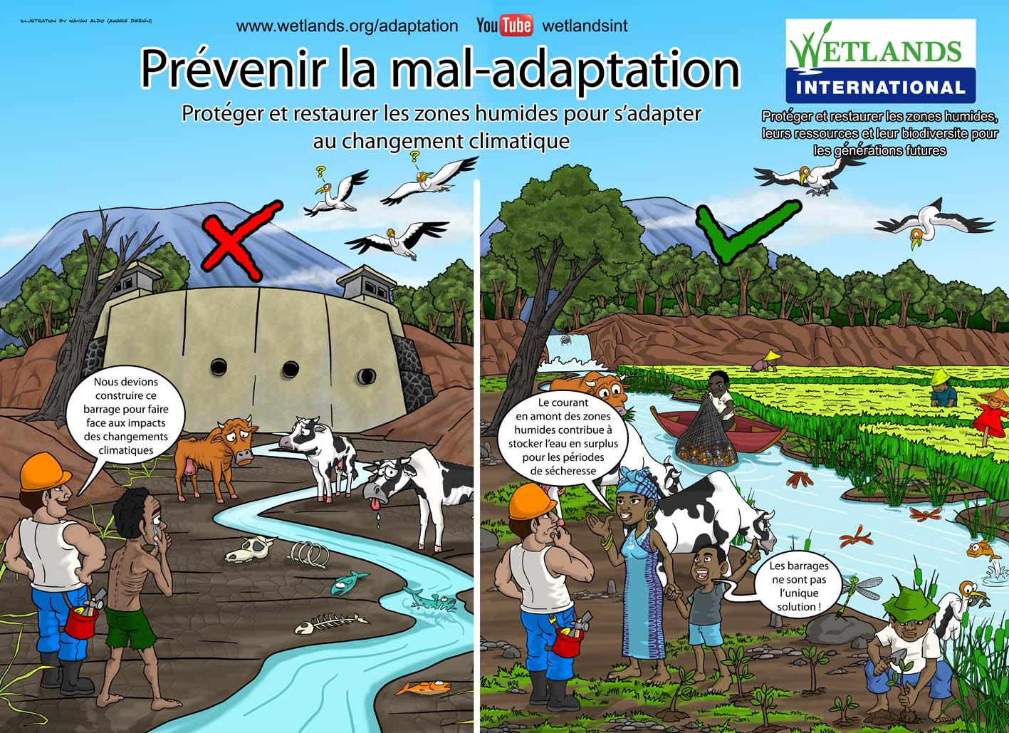 “Prevent mal-adaptation: protect and restore wetlands to adapt to climate change” is the title of this double-sided cartoon poster explaining how wetlands serve to mitigate impacts and thereby help to adapt to climate change.